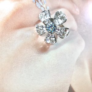大粒な高品質のクリスタルを4枚の花びらにしたクロスフラワー。上下と左右の花びらが対象で、まるで十字架のようなフォルムです。花びらの角度は微妙にカスタマイズできます。ネックレスや、ピアス/イヤリング、指輪に加工できる作品です。