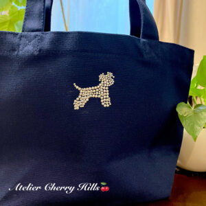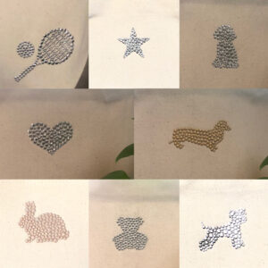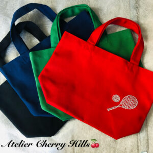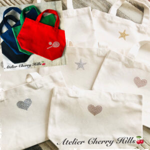 ミニキャンバストートバッグに、可愛らしい動物シルエットやテニスラケットでキラキラのワンポイントを施しました。