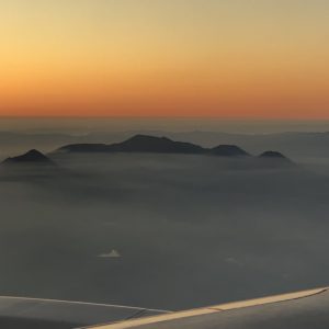 自然とはなんと美しいものなのでしょうか。私たち人間も小さい存在だけれど、この自然の一部なのだとなぜか改めて思いました。そして無事到着。夕暮れ時に浮かび上がる空港もまた綺麗。