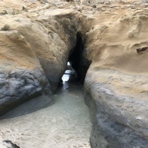 名勝「千座の岩屋」へもちらりと立ち寄りました。ここは、干潮時にはこの洞窟を歩いて通れるとのこと。この時は潮が満ちていて諦めましたが、夏に水着を着てならばこの水深なら通れそうですね。