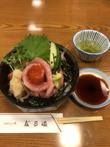 家族が注文した海鮮が乗った天丼はとても美味しそうでしたが、油物をたくさん食べられない私は、こちらのマグロ三昧丼に。