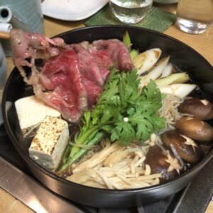 仙台最後の夜は、仙台牛のすき焼きで締めました。すき焼きの【かとう】さんの女将にテーブルで作っていただき、たいへん美味しく頂きました。こちらのすき焼きにはささがき牛蒡が入っています。そして割下ではなく、お醤油と砂糖とみりんで作ったタレです。最後はうどんを入れて、すき焼きの美味しさすべてを絡ませて頂きます。