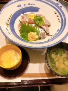 こちらは板前料理ということで、一味違うお洒落な盛り付けでした。大きなお皿に盛った海鮮丼は、一見すると量が少ないように見えますが、しっかりたっぷりと入っていました(^^) 私はアジ丼、同行した家族は海鮮丼、全てお魚は新鮮そのものでした。わざわざ寄った甲斐がありました! 沼津港でゆっくりと食事を楽しみたい方にはお勧めです。