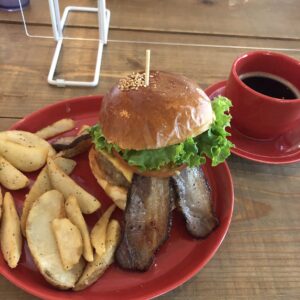 名護市にあるハンバーガーショップ。11時〜15時までしか営業していないので、要注意です。ボリューム満点で雰囲気もナチュラル、素敵なお店でした。スペシャルバーガーをチョイス。大満足です!