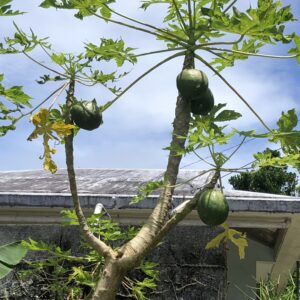 滞在した瀬底島にも『かどや製麺所』という沖縄そばのお店がありました。実がなっているパパイヤの木が庭にあり、オープンエアーの、いかにも南国の島のお店でのんびりといい感じ。こちらの麺は少し太め、三枚肉も分厚く食べ応えありでした。
