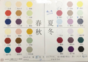 『着物パーソナルカラー診断』ですので、日本の伝統色の正絹のドレープ32色を使って肌・髪・瞳の色に調和する色やいきいきと綺麗に見える色を見つけていくというものでした。例えば利休鼠色や茄子紺色など耳慣れないけれど着物に使われている色目の布(正絹)を使うので、通常のパーソナルカラー診断とは色合いも少し違うと思いますが、イエローベース(スプリング・オータム)・ブルーベース(サマー・ウインター)といった仕分けは同じですし、どういう色合いが自分に合っているのかを知ることができます。ちなみに、基本のカラータイプは上記の4つ(イエベ春・イエベ秋・ブルベ夏・ブルベ冬)ですが、もっと細かく分けるカラー診断もあるようです。